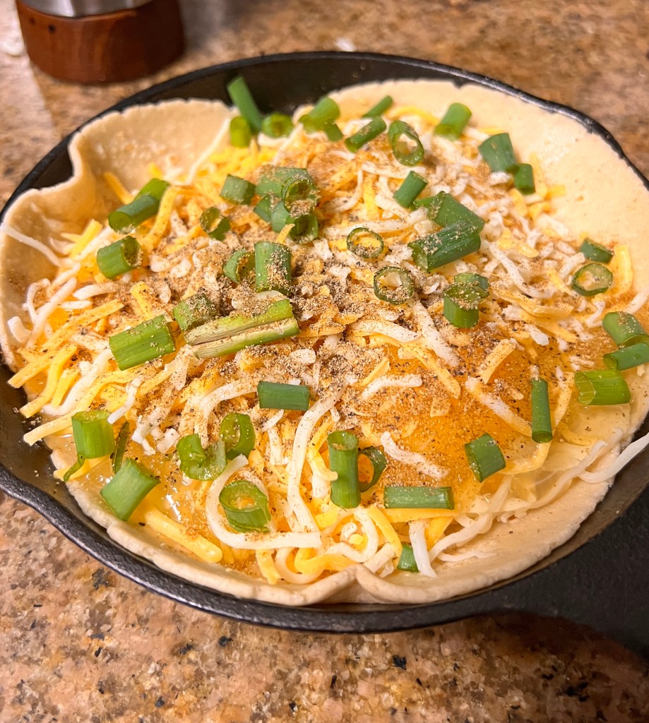 - I laid down a layer of shredded cheese first then cracked my eggs on it and added another layer of cheese on top. I then added green onion, salt, pepper, and cumin.