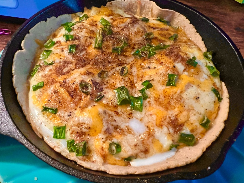 - I used an 8″ cast iron pan to bake it in the oven, which worked well with my 10″ flour tortilla, giving it just enough of a “lip” to keep the eggs contained and not escape underneath the tortilla.